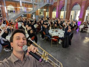 Un blindtest à la trompette est une animation musicale interactive où les participants doivent identifier des morceaux de musique joués en direct par un trompettiste.